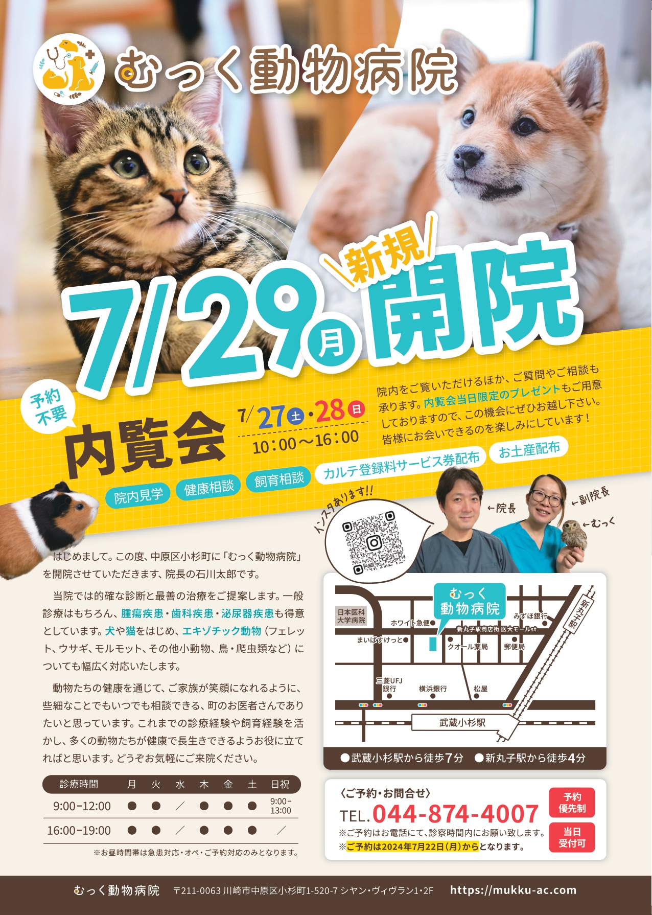 2024年7月29日(月)の開院に先駆けて、27日(土)・28日(日)の10時~16時まで、むっく動物病院の内覧会を開催いたします! 内覧会では、 獣医師による無料相談:動物たちの健康や飼育に関するお悩みや疑問をご相談いただけます。 院内見学:診察室、手術室、入院室など、院内を自由にご覧いただけます。 最新医療機器のご紹介:最新の医療機器を用いた検査や治療について、詳しくご説明いたします。 その他、カルテ登録料サービス券配布やお土産もご用意しております。 ご家族連れも大歓迎です! ぜひ、この機会にむっく動物病院にお越しいただき、当院の雰囲気やスタッフ、医療設備などを体感してください。 皆様のご来場を心よりお待ちしております。 むっく動物病院 お知らせ よかったらシェアしてね! URLをコピーしました! URLをコピーしました! 開院しました 関連記事 11月休診日のお知らせ 2025.10.16 10月休診日のお知らせ 2025.09.20 9月休診日のお知らせ 2025.09.20 開院しました 2024.09.10